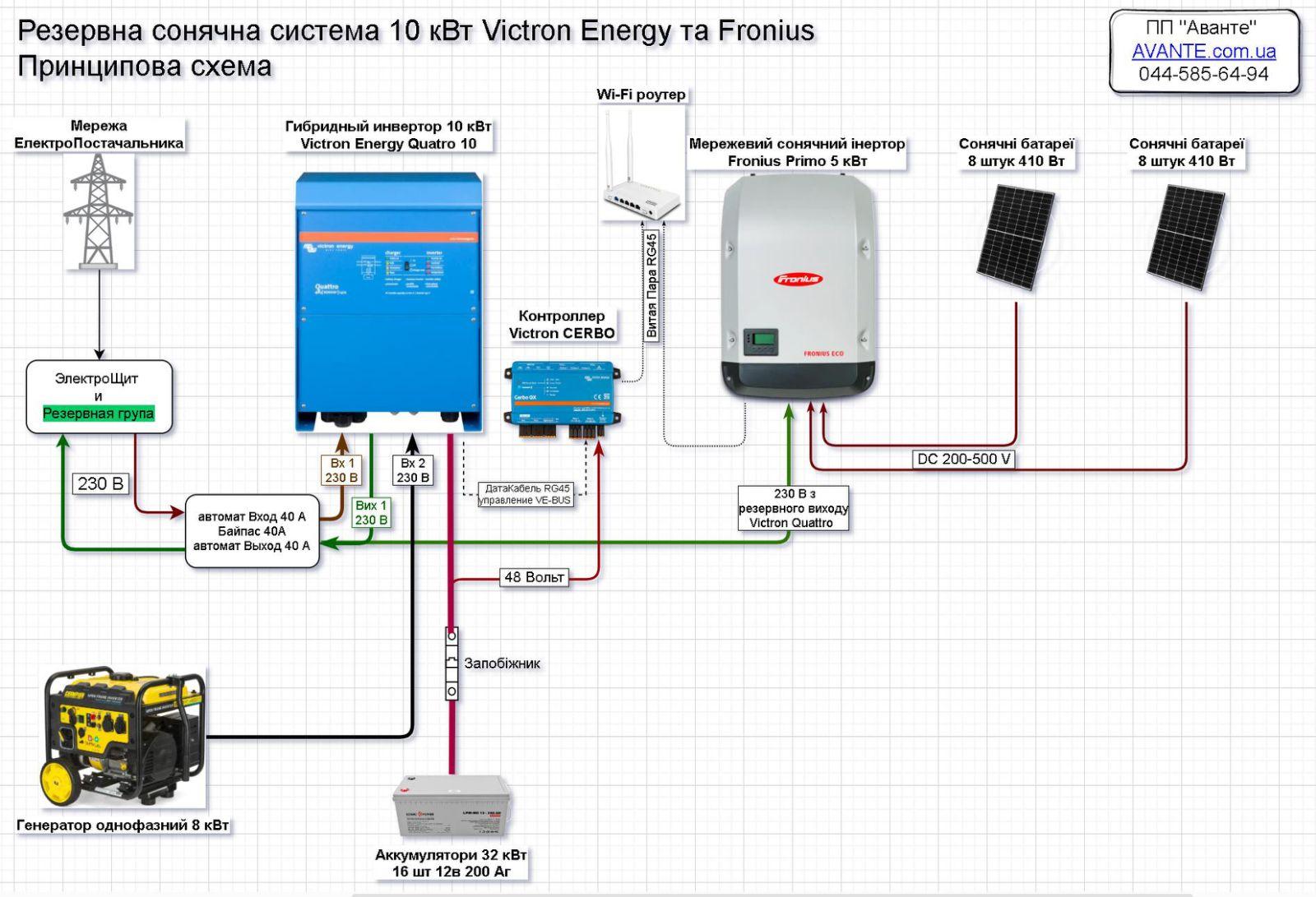 Далі наводиться схема підключення резервної сонячної системи потужністю 10 кВт, що використовує інвертори Victron Energy та Fronius. Система забезпечує безперебійне живлення вашого будинку в разі відключення електроенергії.