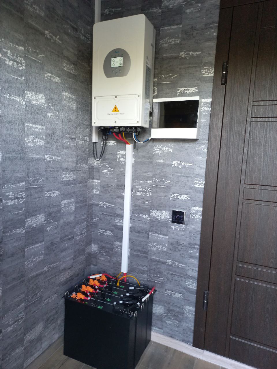 Для забезпечення стабільного електропостачання приватного будинку в Київській області було встановлено резервну сонячну систему потужністю 6/10/5 кВт. Основу системи складає інвертор Deye та 4 акумуляторні батареї Dyness по 2,4 кВт кожна, що забезпечують до 9,6 кВт∙год резервної енергії.
