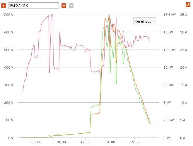 Я помітив, що коли мої батареї вкриті снігом, вони дають напругу (фіолетова), але не дають струму (зелена), що свідчить про те, що вони генерують дуже мало (червона) електроенергії.