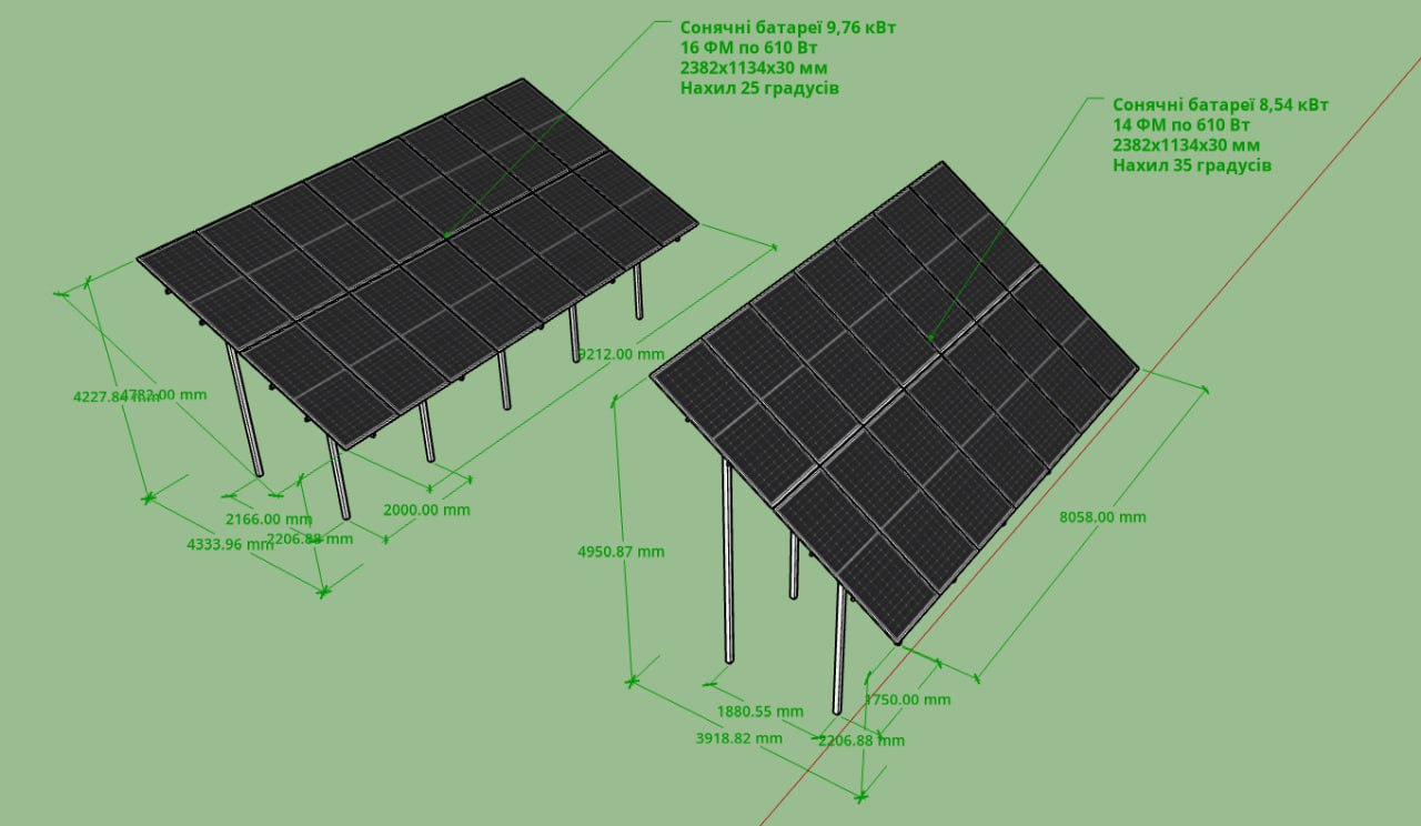 Цей етап ескізного проектування був ключовим для демонстрації переваг багатофункціонального рішення. Ми показали, як конструкція з панелями може гармонійно вписатися в простір біля дому, створюючи не лише джерело енергії, а й затишну зону для відпочинку. Це дозволило б не лише генерувати електроенергію, але й створити комфортне місце для сімейних зустрічей та приємного проведення часу на свіжому повітрі.