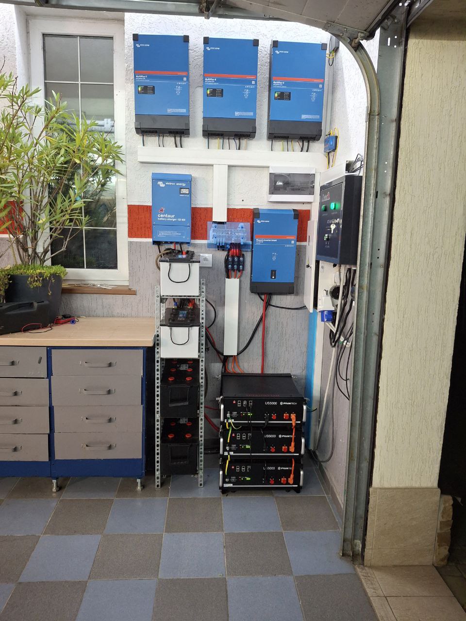 Основою системи є інвертори Victron Energy Quattro 5 кВт, що забезпечує трьохфазне живлення. Для зберігання енергії використані акумуляторні батареї Pylontech US5000 ємністю 5 кВт кожна, відомі своєю надійністю та довговічністю.