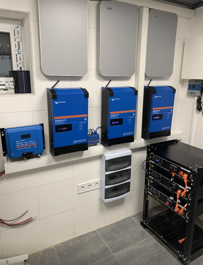 Система складається з трьох інверторів Victron Energy MultiPlus II 5kVA, які працюють паралельно. Завдяки цьому система може забезпечити резервне живлення потужністю до 15 кВт. Інвертори оснащені MPPT-контролерами, які дозволяють максимально ефективно використовувати енергію від сонячних панелей.