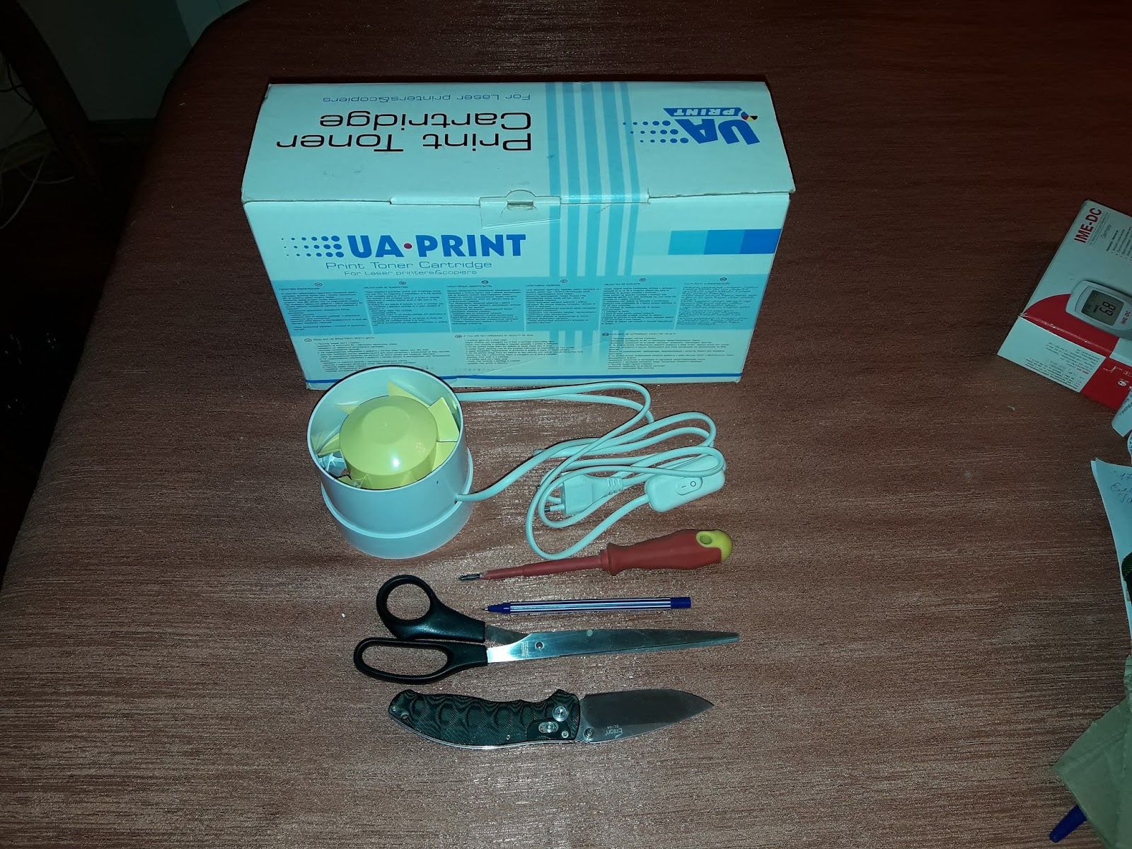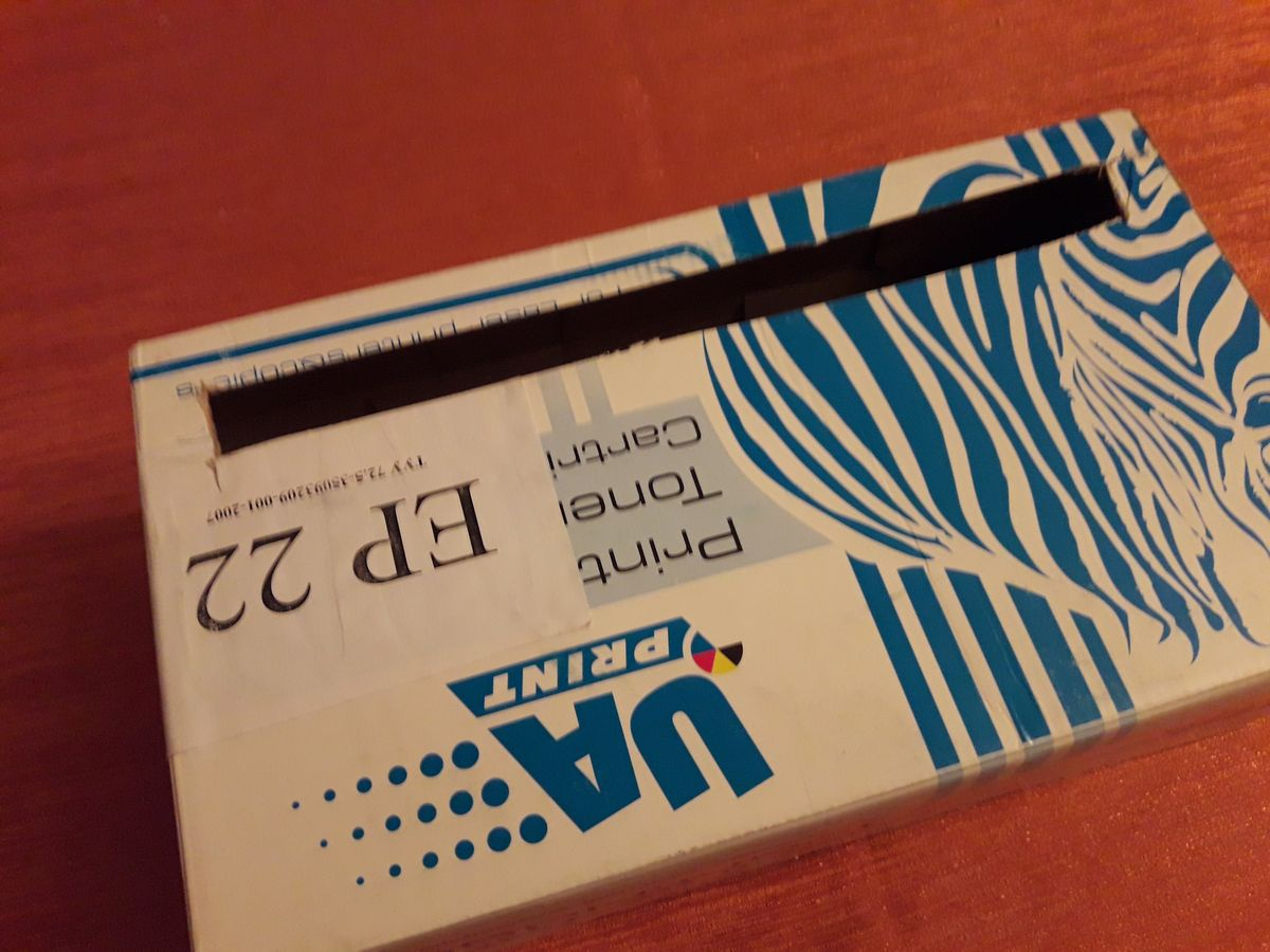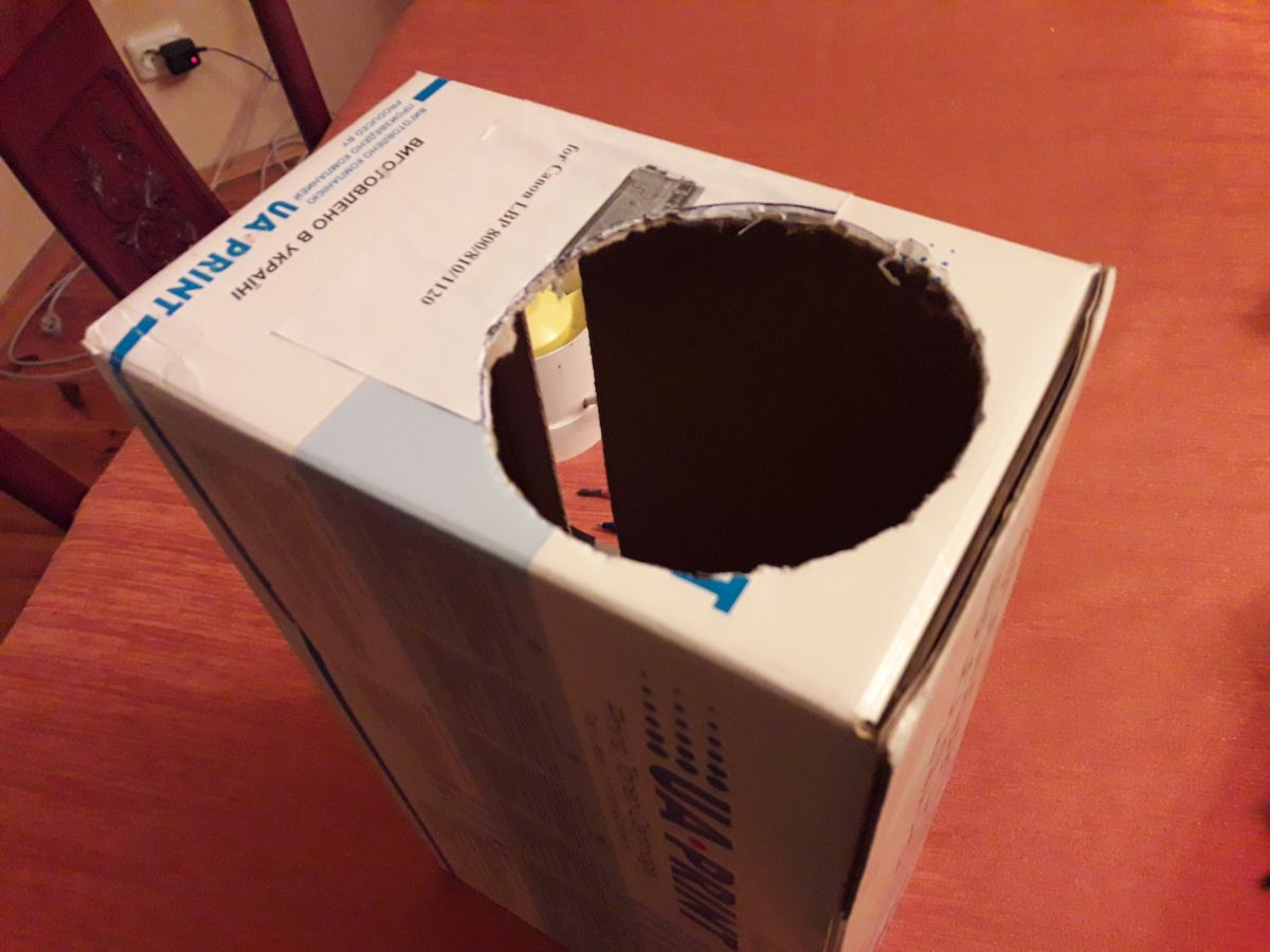 Підібрав відповідного розміру коробки з під взуття та картриджа для принтера, зробив розмітку та вирізав отвори для встановлення вентилятора та виходу повітря.